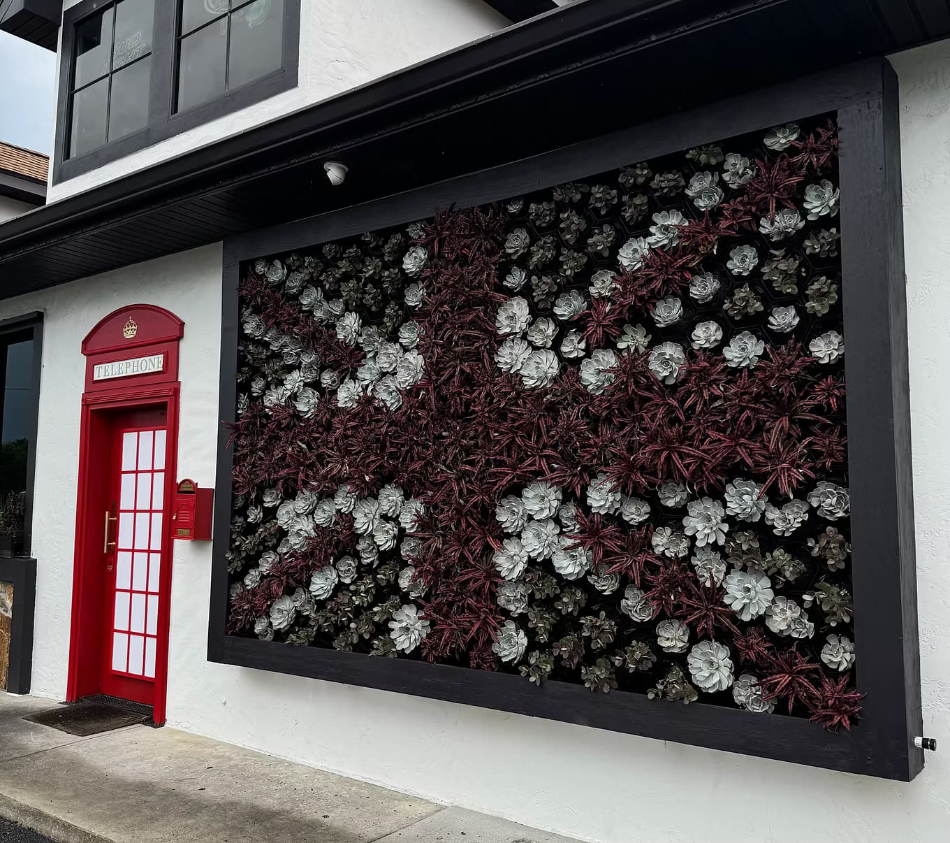 Covering over 200 sq feet of wall space these are the largest exterior living walls in all of the Space Coast. They are also extremely unique in that they provide a to-scale near representation of both flags in design. Designer and Installer Frida’s won the Silver Award for Succulent Walls at the 2025 International Tropical Plant Expo. Plant enthusiasts would have to travel to the Miami or Los Angeles areas to see comparable walls.
